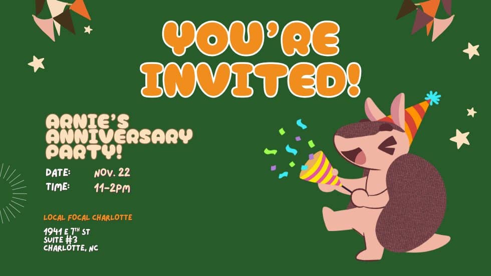 Celebrate two years of Arnie the Armadillo with local children’s book author, Eden Estabrook. The party will be at Local Focal Charlotte, 1941 E 7th Street, Charlotte, North Carolina, on Saturday, November 22, 2025, from 11 a.m. to 2 p.m.