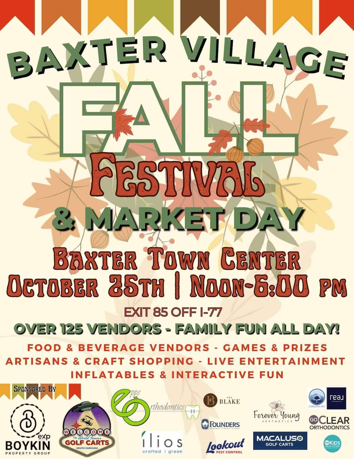 The Baxter Village Fall Festival and Market Day will take place Saturday, October 25, 2025, from 12 p.m. to 6 p.m., at Baxter Village, 940 Market Street, Fort Mill, South Carolina.