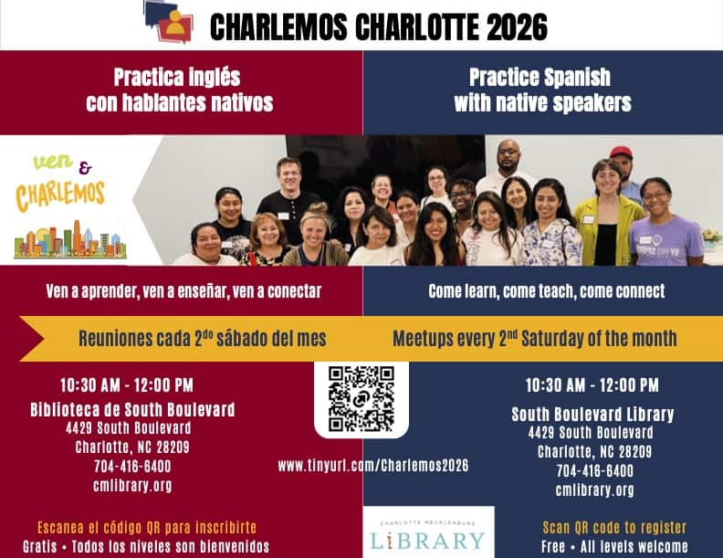 South Boulevard Library, 4429 South Blvd, Charlotte, NC, is hosting a free immersive, bilingual, language exchange program. It takes place inside the Community Room (the large room toward the back of the library.)