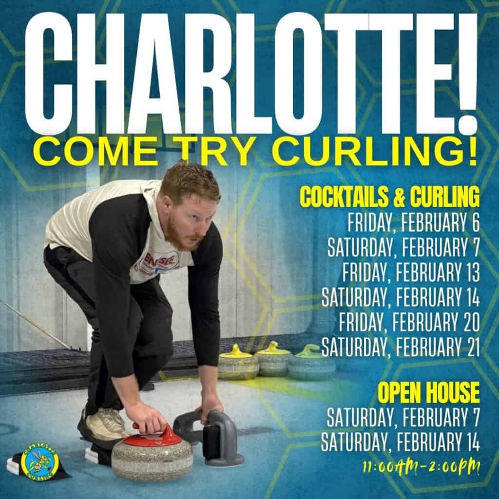 If you’re interested in a full lesson or a “Cocktails and Curling” event, check out the Learn to Curl events on CharlotteCurling.com.