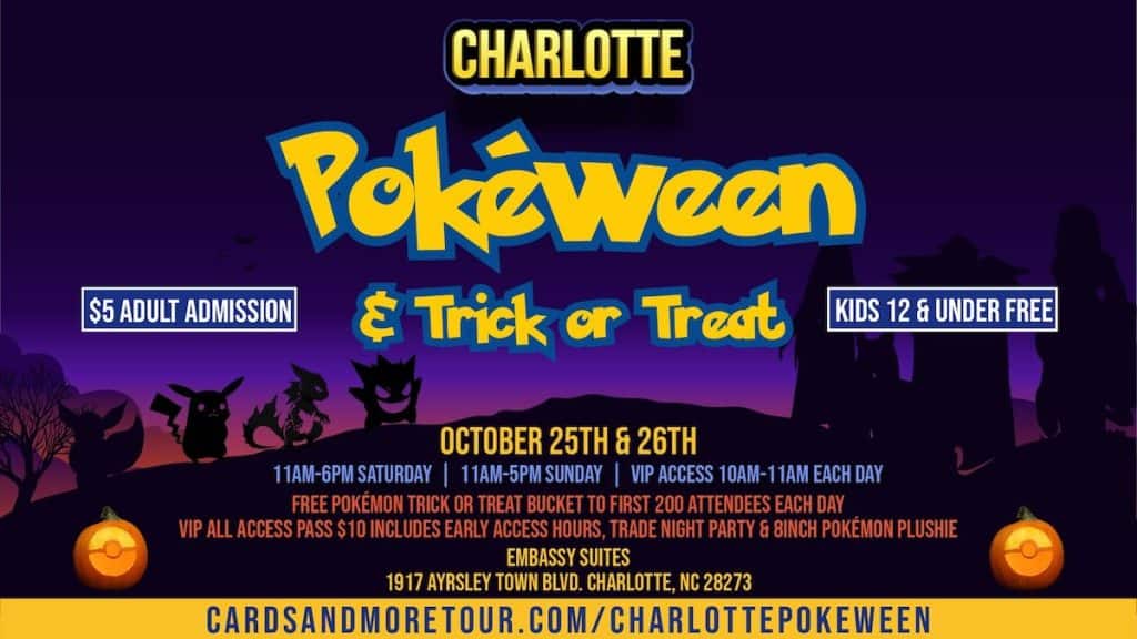 Charlotte Pokéween & Trick or Treat will be at Embassy Suites, 1917 Ayrsley Town Blvd, Charlotte, North Carolina, on October 25 and 26, 2025.