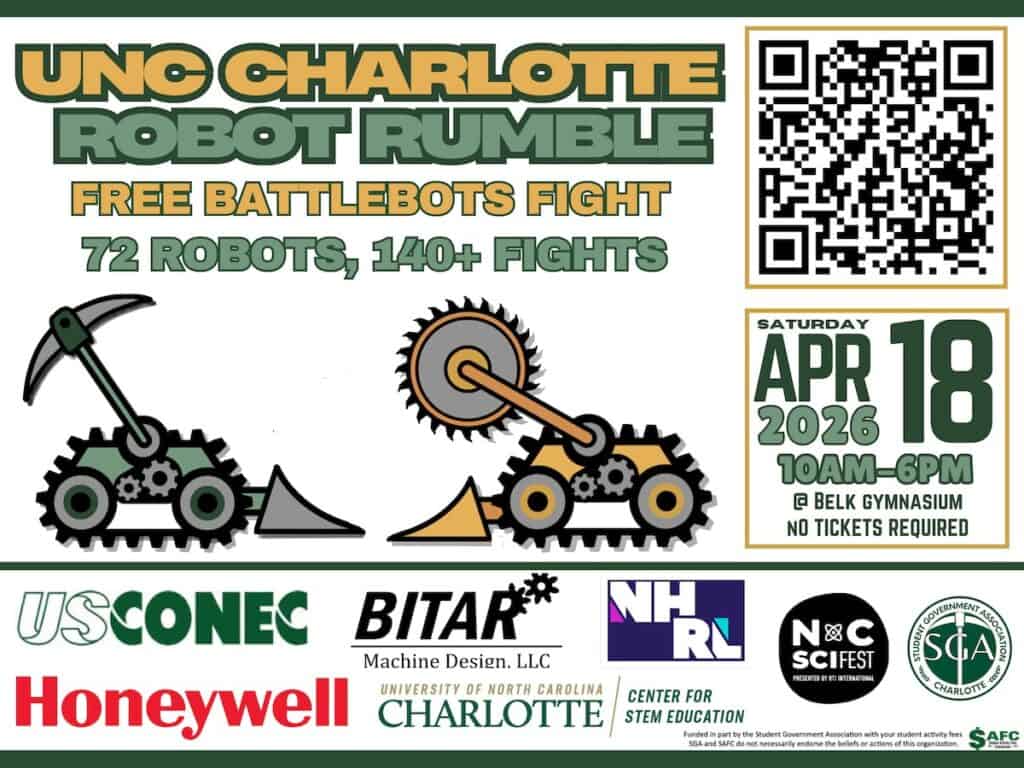 The UNC Charlotte Combat Robot Club is hosting the Charlotte Robot Rumble on Saturday, April 18, 2026, from 10 a.m. to 6 p.m., at Belk Gym, at UNC Charlotte, 8911 University Road, Charlotte, North Carolina.