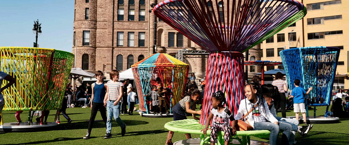 “Los Trompos” (“Spinning Tops” in Spanish) draws its inspiration from a toy that has been popular with children around the world since the dawn of time. This large scale, interactive artistic installation engages visitors in a way that is both meaningful and playful.