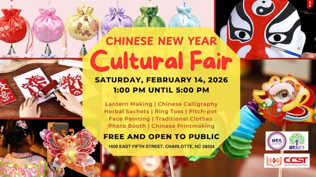 Charlotte Chinese Story Time is presenting Chinese New Year Cultural Fair on Saturday, February 14, 2026, from 1 to 5 p.m., at Hope Hall at Caldwell Presbyterian Church, 1609 East 5th Street, Charlotte, North Carolina. This is a rescheduled date and a new location, due to the weather forecast on January 31.