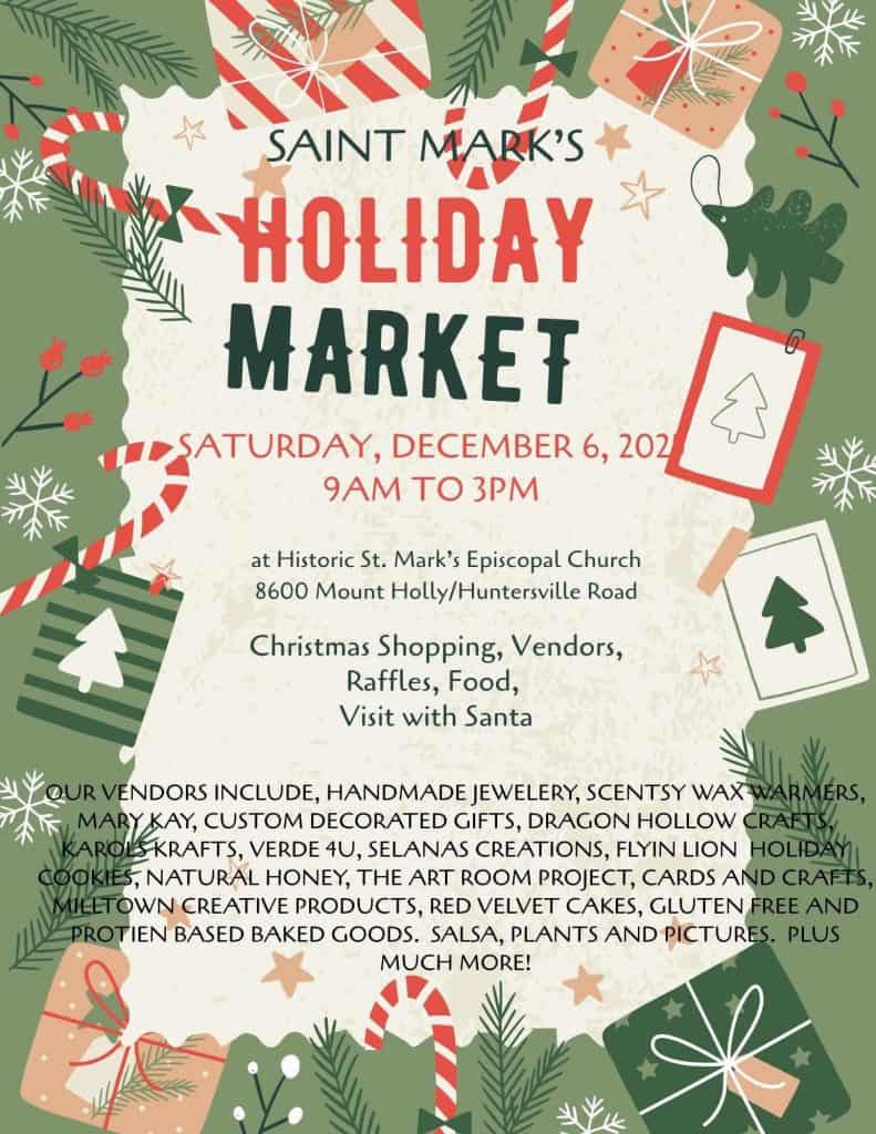 St. Mark’s Episcopal Church, 8600 Mount Holly Huntersville Road, Huntersville, North Carolina, is hosting a Christmas market on Saturday, December 6, 2025, from 9 a.m. to 3 p.m.