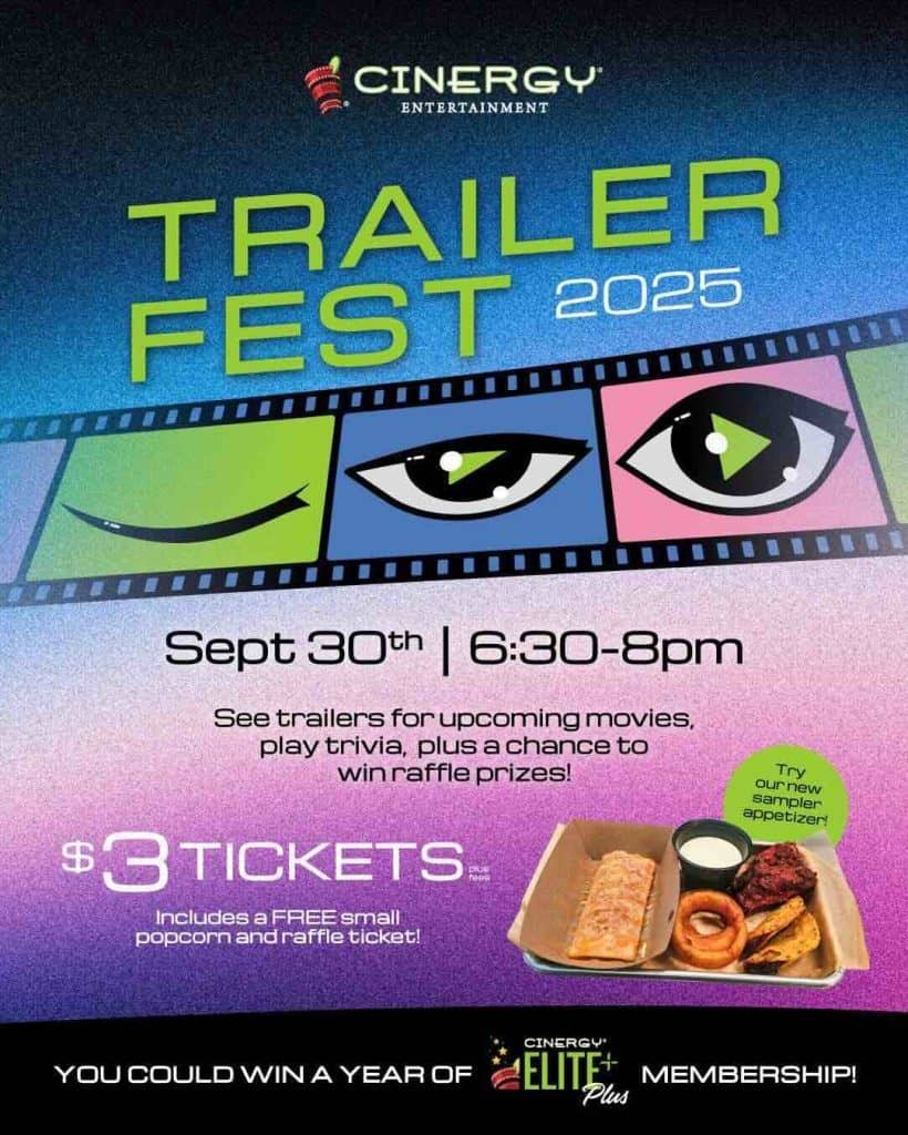 Cinergy Dine-in Cinemas, at 5336 Docia Crossing Road, Charlotte, North Carolina, is presenting Trailer Fest on Tuesday, September 30, 2025, from 6:30 to 8 p.m.