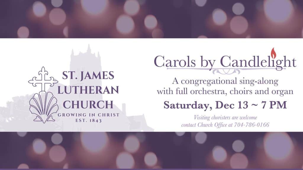 Join us for a congregational sing-along of Advent and Christmas Carols accompanied by full Orchestra, Organ and the Parish & Bell Choirs. Visiting choristers are welcome. Please contact the church office.