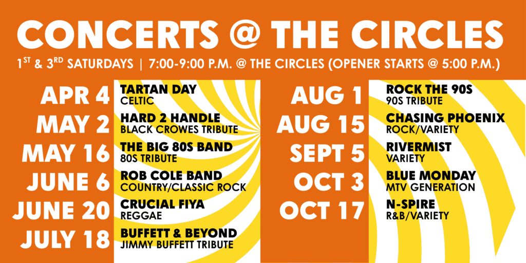 Davidson’s Concerts @ the Circles take place on select first and third Saturdays of the month from April 4 to October 17, 2026, on Jetton Street by Clean Juice, 605 Jetton Street, Davidson, NC.