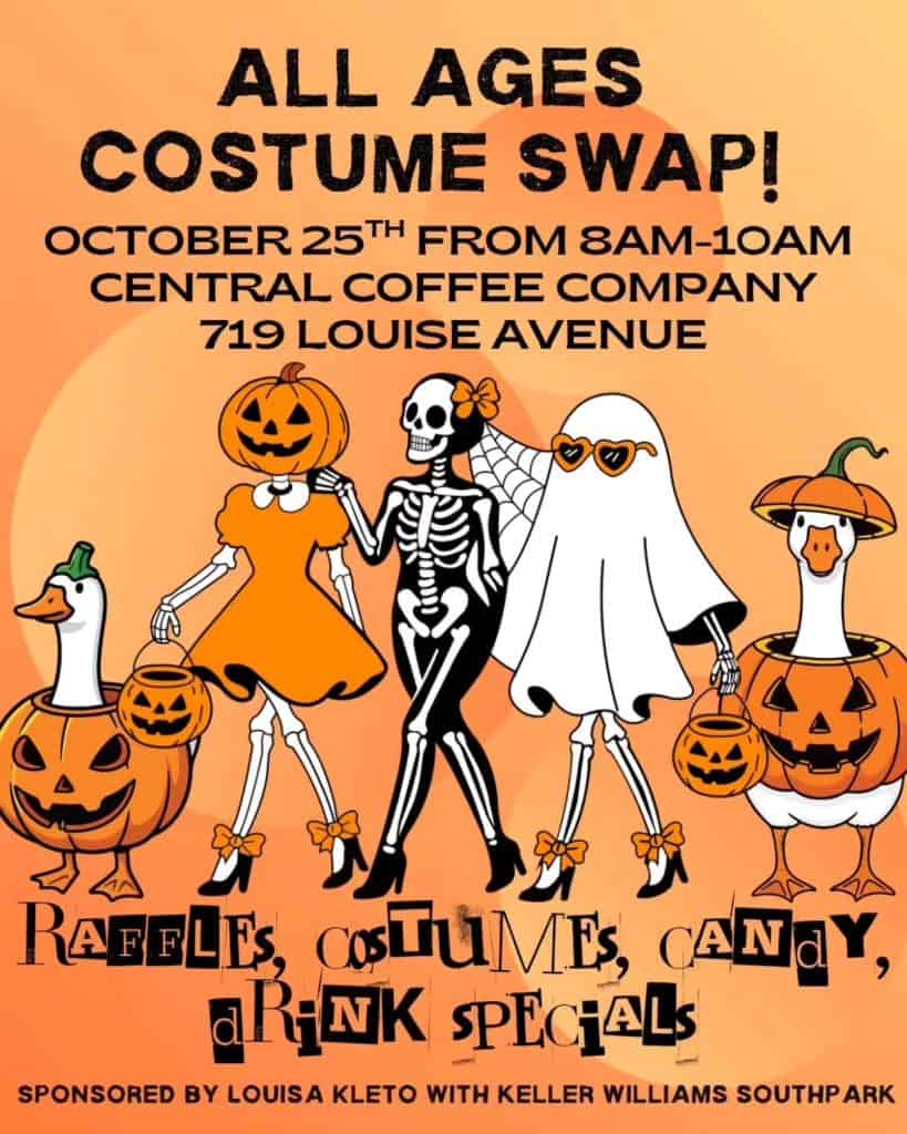 Central Coffee Co. and Louse Kleto with Keller Williams Southpark are holding a costume swap on Saturday, October 25, 2025, from 8 to 10 a.m., at the shop at 719 Louise Avenue, Charlotte, North Carolina.
