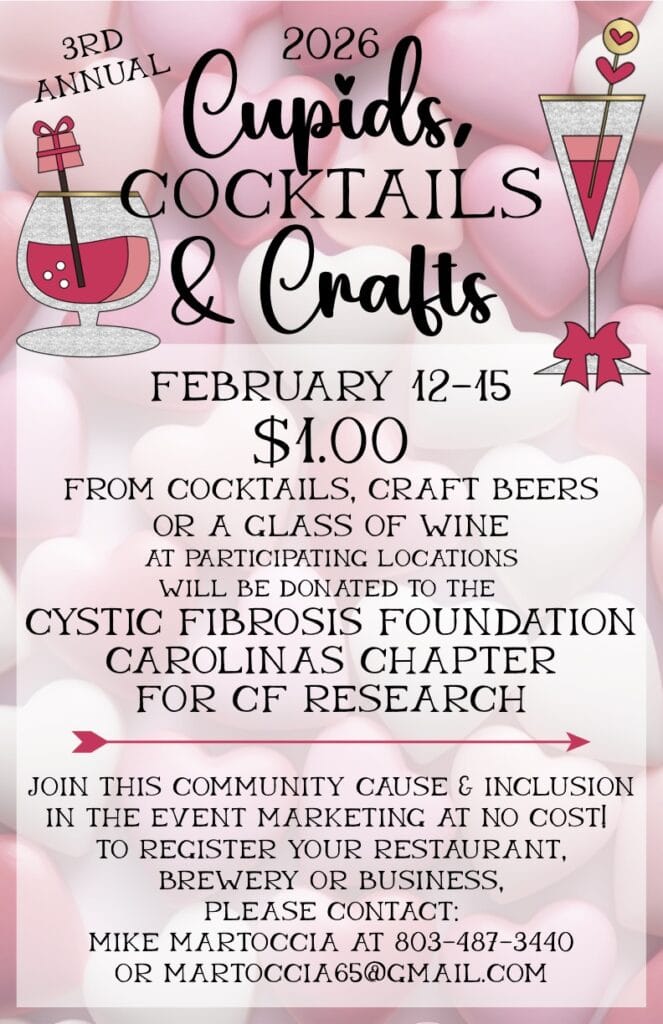 During the 3rd Annual Cupids, Cocktails & Crafts To Benefit The Cystic Fibrosis Foundation, many restaurants and breweries in Charlotte, Fort Mill, Rock Hill, and more, are donating $1 from select craft beers, specialty drinks/cocktails, glasses of wine and selected cuisine to the Cystic Fibrosis Foundation.
