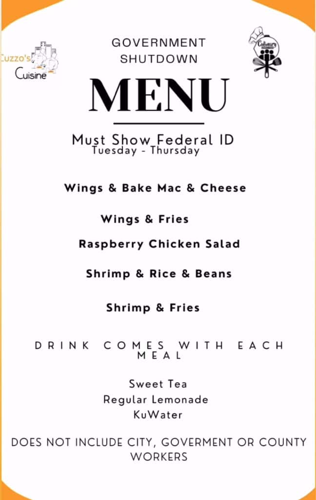 Cuzzo’s Cuisine, at 9610 N Tryon Street, Charlotte, North Carolina, is offering free meals to federal employees who are not being paid.