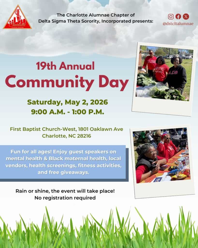 The Charlotte Chapter of Delta Sigma Theta Sorority, Incorporated, is hosting its 19th Annual Community Day on Saturday, May 2, 2026, from 9 a.m. to 1 p.m., at First Baptist Church West, 1801 Oaklawn Avenue, Charlotte, North Carolina.