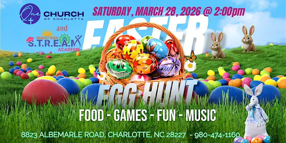 One Church of Charlotte, 8823 Albemarle Road, Charlotte, North Carolina, along with Smart Kids S.T.R.E.A.M. Academy is hosting an Easter Egg Hunt event on Saturday, March 28, 2026, from 2 to 5 p.m.