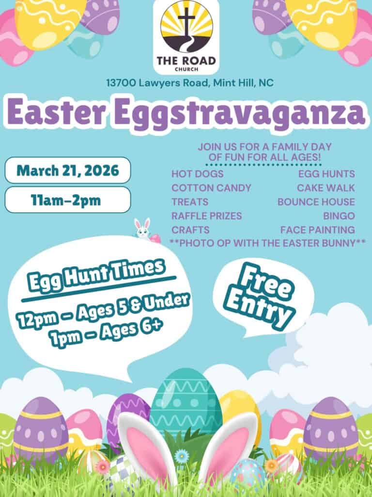 The Road Church, 13700 Lawyers Road, Mint Hill, North Carolina, is hosting an Easter Eggstravaganza on Saturday, March 21, 2026, from 11 a.m. to 2 p.m.