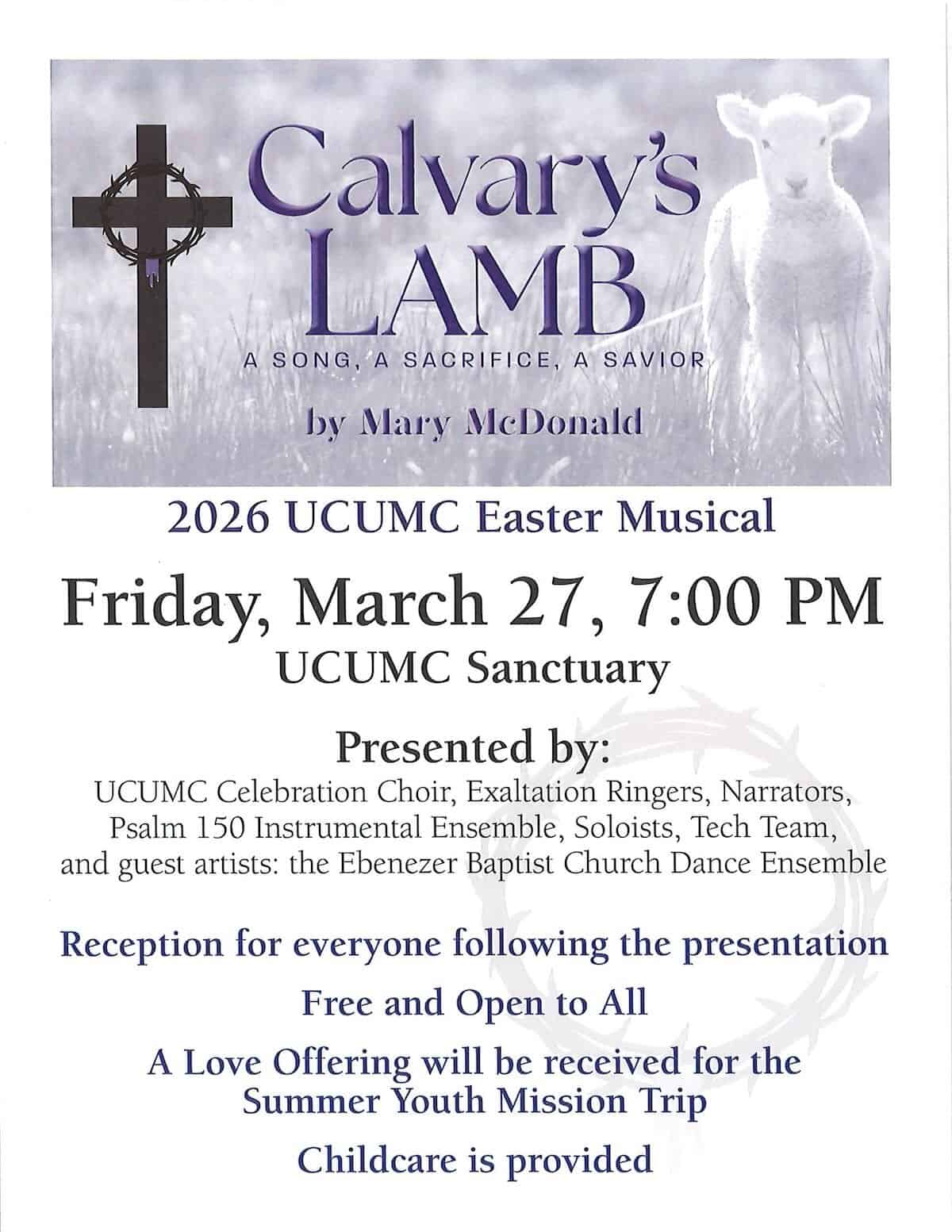 University City United Methodist Church is presenting an Easter Musical: Calvary’s Lamb on Friday, March 27, 2026, from 7 to 8:30 p.m.