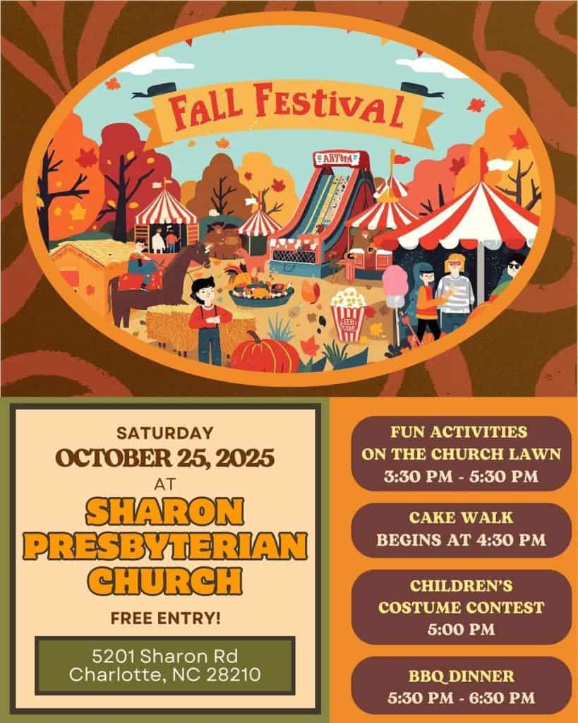 Sharon Presbyterian Church, 5201 Sharon Road, Charlotte, North Carolina, is holding its annual fall festival on Saturday, September 25, 2025, from 3:30 to 5:30 p.m. A BBQ dinner (for purchase) follows from 5:30 to 6:30 p.m.