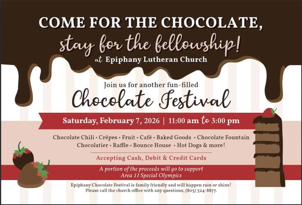 Epiphany Lutheran Church in Rock Hill is presenting its Chocolate Festival on February 7, 2026, from 11 a.m. to 3 p.m. Celebrate all things chocolate! Admission is free, with items for purchase.