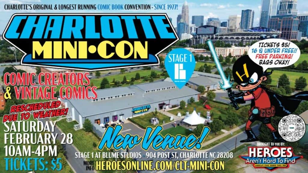 Charlotte’s original comic book convention, Charlotte Mini-Con, takes place Saturday, February 28, 2026, from 10 a.m. to 4 p.m., at Stage 1 at Blume Studios, 904 Post Street, Charlotte, NC. Admission is $5, and is free for ages 16 and under with a paying adult.