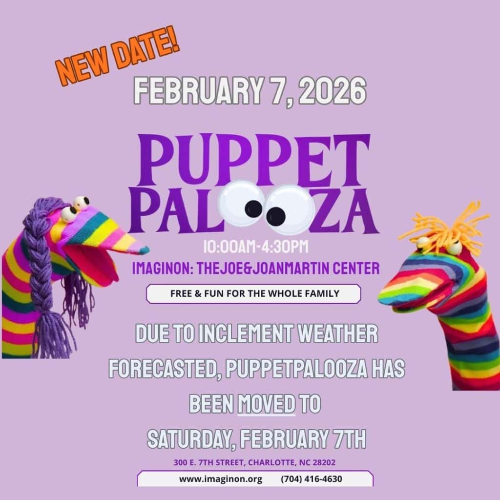 ImaginOn, at 300 E 7th Street, Charlotte, North Carolina, is hosting Puppet Palooza, an all-day celebration of puppets, on Saturday, February 7, 2026, from 10 a.m. to 4:30 p.m. This free event features giant roving puppet karaoke, performances, puppet crafts and so much more.