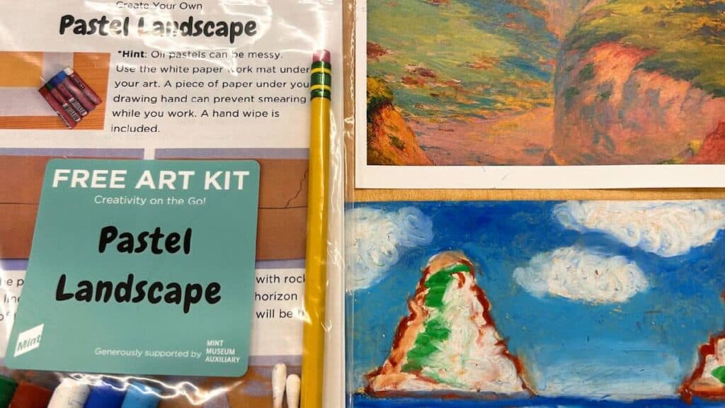 Mint Museum Randolph, at 2730 Randolph Road, Charlotte, North Carolina, regularly offers free art kits, which are related to one of the museum’s exhibits or pieces of art. In general, the art kits are available once a month, for a four-day period.