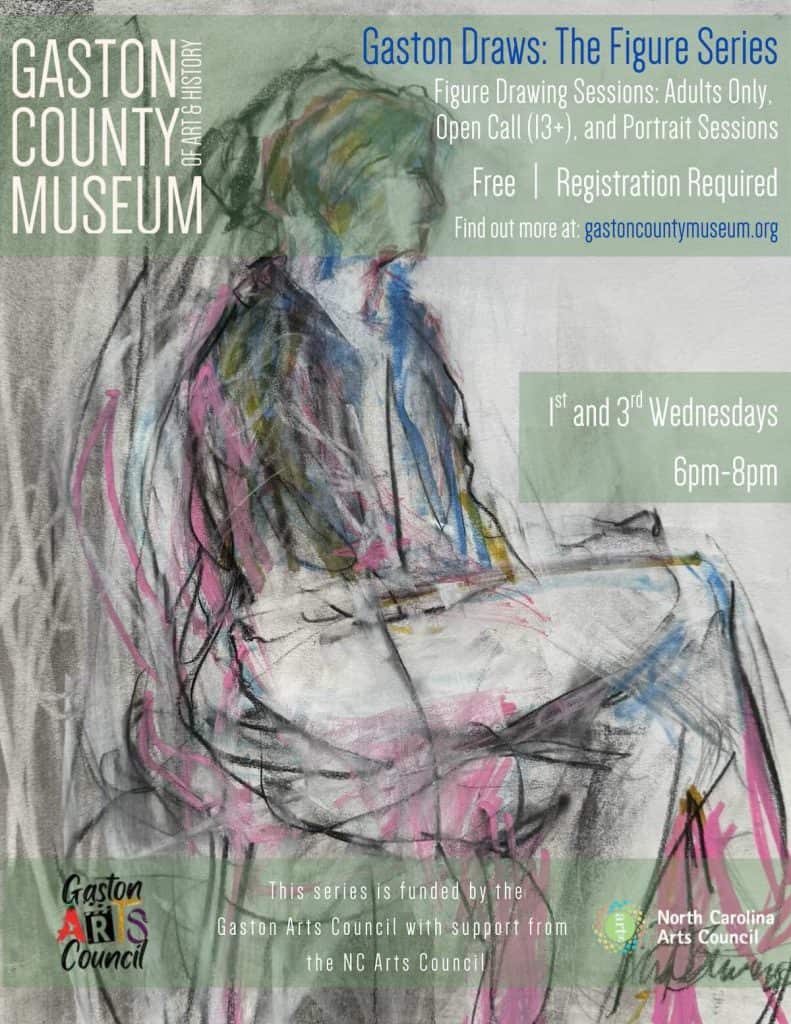 The Gaston County Museum of Art & History is hosting a year-long series of live-model figure drawing sessions. These are free events that will take place in the Anne Biggers Furr Learning Station, 205 W Main Street, Dallas, North Carolina.