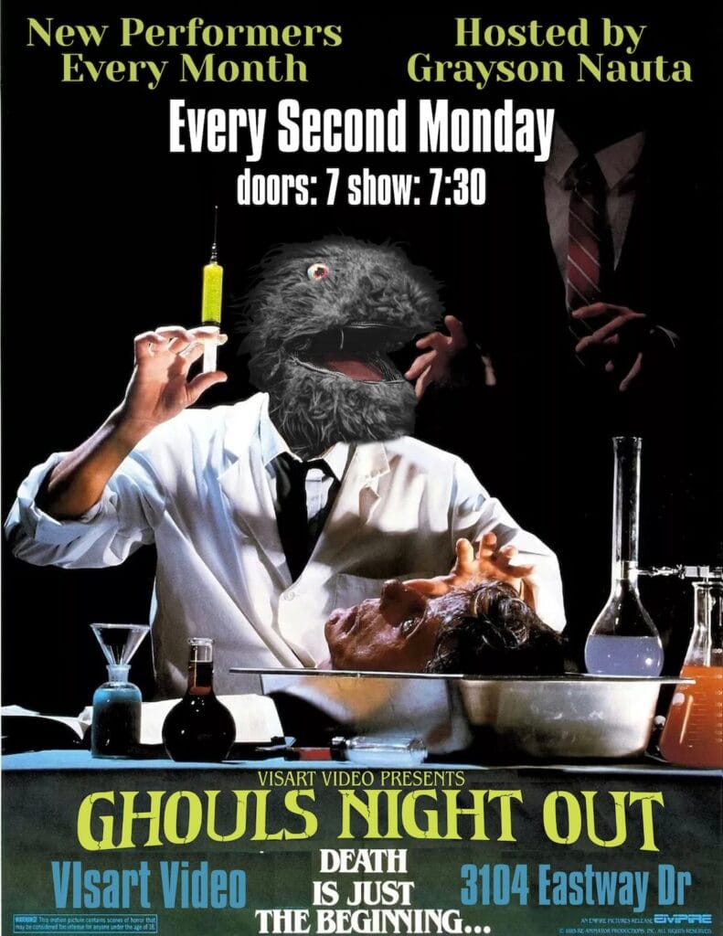 The second Monday of the month, VisArt Video is hosting Ghouls Night Out from 7 to 9 p.m. Ghouls Night Out is a campy horror movie with puppets voiced by local comedians providing hilarious commentary.
