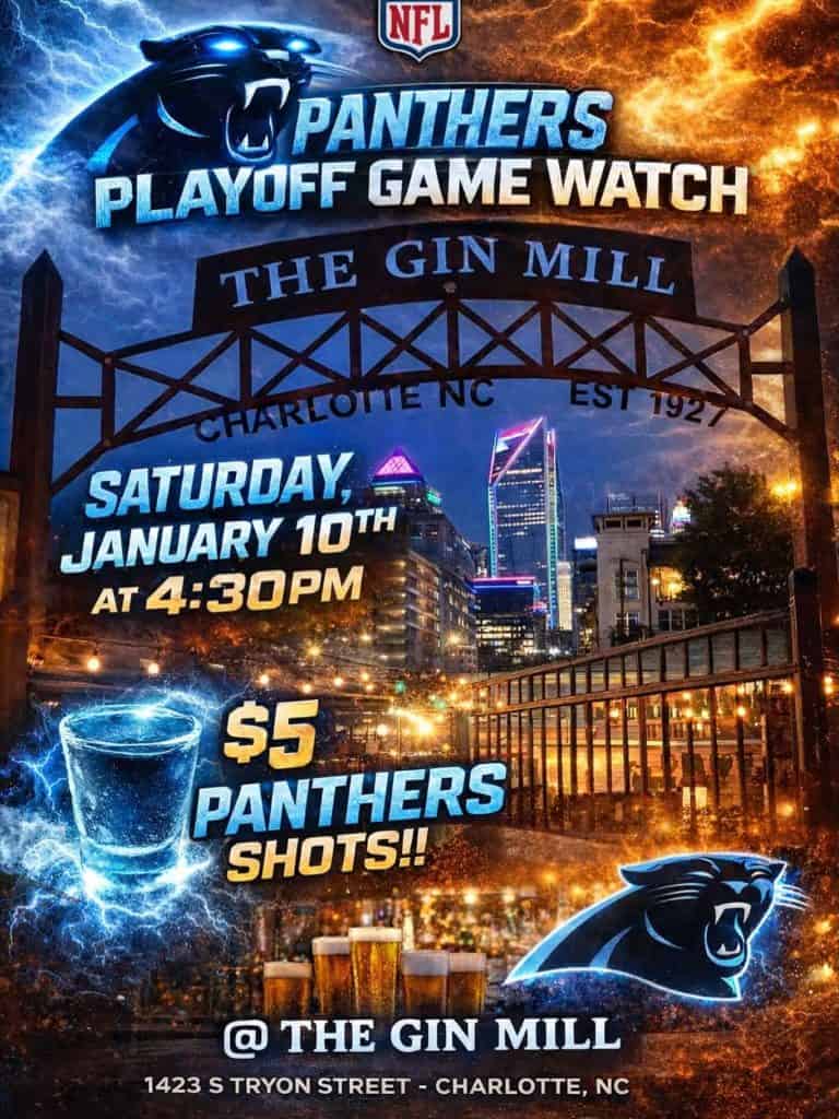 Playoff football is back in Charlotte! The Gin Mill, 1423 S Tryon Street, Charlotte, North Carolina, is hosting a Panthers Playoff Game Watch on Saturday, January 10, 2026, at 4:30 p.m. But get there early to grab a shot.