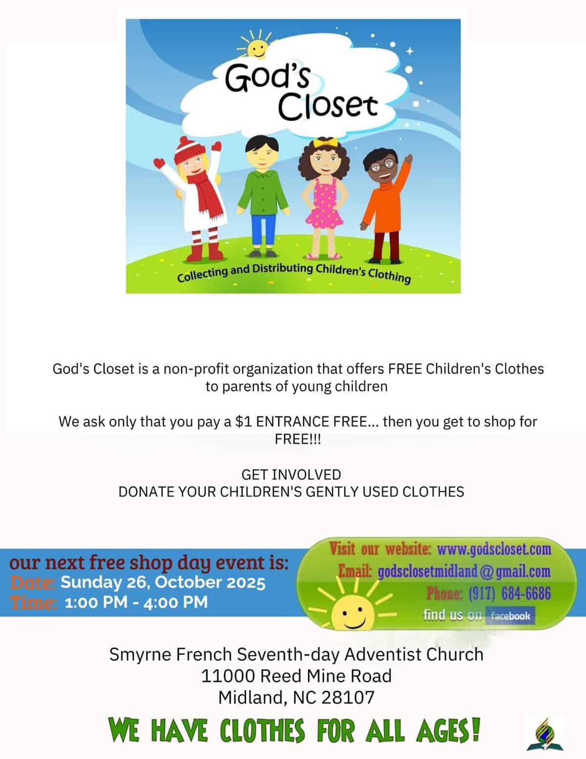 The Free Shop Day takes place Sunday, October 26, 2025, from 1 to 4 p.m., at Smyrne French SDA Church of Charlotte, 11000 Reed Mine Road, Midland, NC. Midland is in southern Cabarrus County, and the church is about 25 miles east of Charlotte.