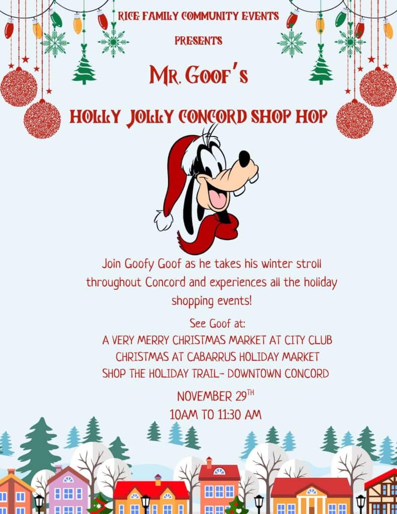 Goofy is going shopping in Downtown Concord, North Carolina, for Small Business Saturday, and you can join him.