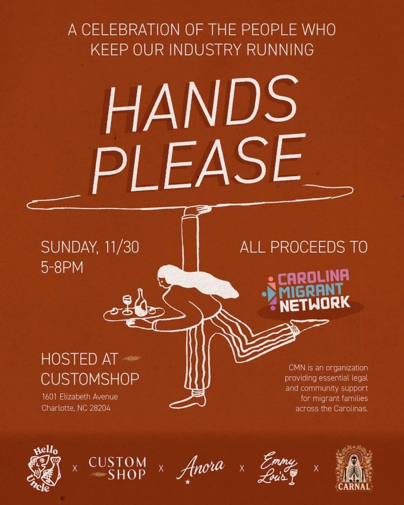 All revenue from “Hands Please” will be donated to the Carolina Migrant Network, supporting legal and humanitarian services for migrant families throughout the Carolinas. La Bodeguita will also have a resource and donation table set up on-site.