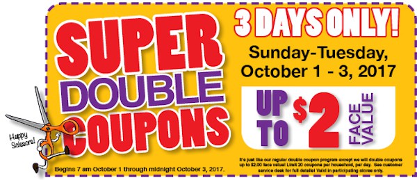 Harris Teeter is holding its Super Doubles event through Tuesday, October 3rd, 2017. What this means is that they’ll double coupons with face values up to $2. Refer to the above link for the rules and limitations.