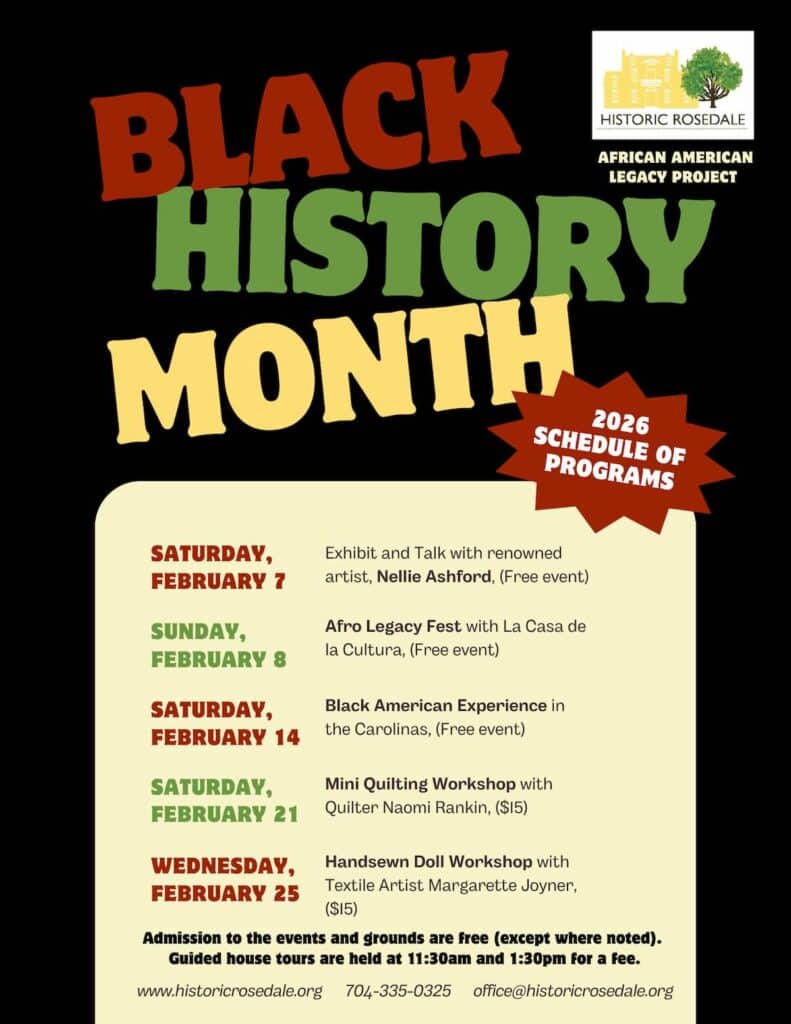 Historic Rosedale, at 3427 North Tryon Street, Charlotte, NC, is hosting several events for Black History Month in February, 2026. Most of the events are free to attend. Please make sure to follow the links below to register, as space is limited at some of the events.