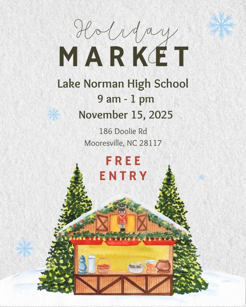 Lake Norman High School Fine Arts Boosters and Athletic Boosters are hosting a holiday market on Saturday, November 15, 2025, from 9 a.m. to 1 p.m., at the school, at 186 Doolie Road, Mooresville, North Carolina.