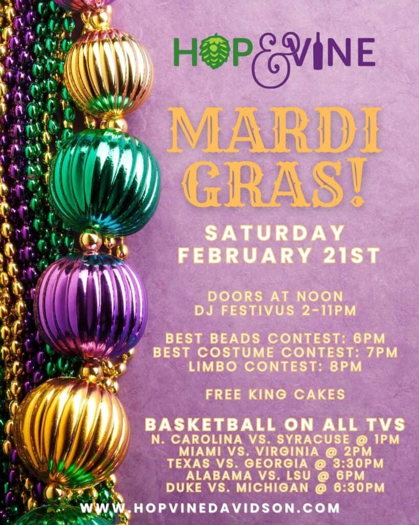 Hop & Vine Davidson, at 605-C Jetton Street, Davidson, North Carolina, is a family-friendly gathering spot, where you can enjoy great wine and craft beer. Hop & Vine hosts many events, which you can find on their website calendar or Facebook page.