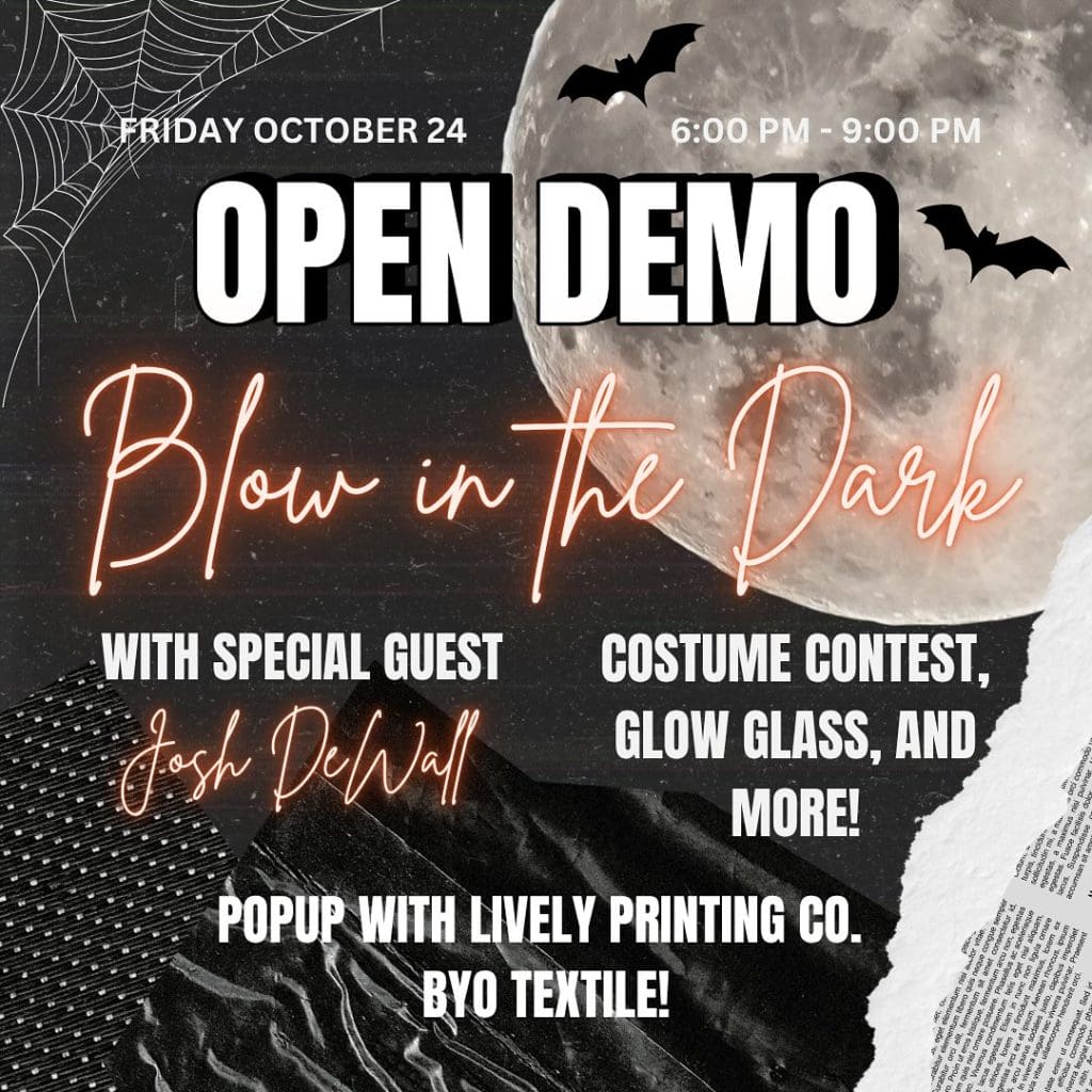 The October 24, 2025, open demo is a special one. At this special Halloween-themed event, Blow in the Dark, the whole demo will take place in the dark, so the only light is natural glow of molten glass and the ovens.