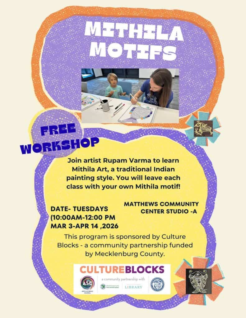 Discover the joy of Mithila Motif ( Indian Folk Art) this spring at Matthews Community Center, 100 E McDowell Street, Matthews, North Carolina.