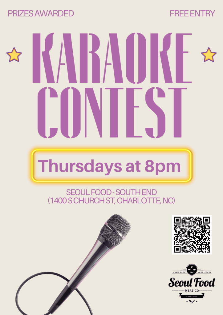 Seoul Food Meat Co. South End, at 1400 S Church Street, Charlotte, North Carolina, is hosting a Karaoke Contest every Thursday from April 2 to August 27, 2026, from 8 to 11 p.m.