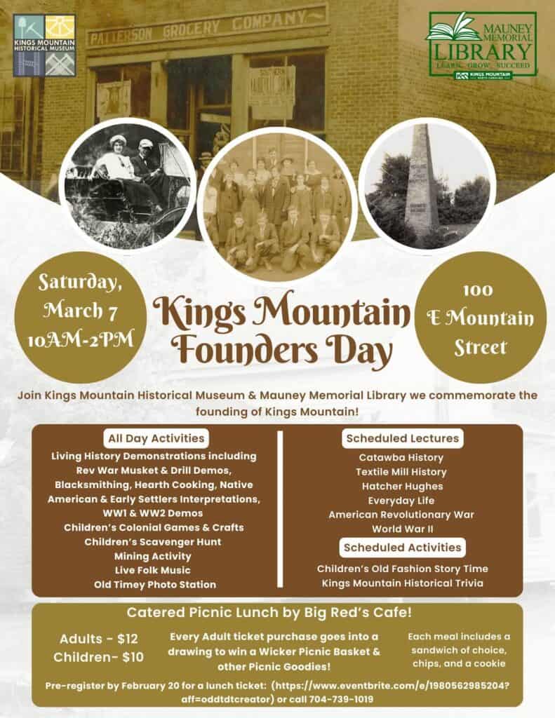 Kings Mountain Historical Museum and Mauney Memorial Library are presenting Kings Mountain Founders Day on Saturday, March 7, 2026, from 10 a.m. to 2 p.m., at 100 East Mountain Street, Kings Mountain, North Carolina.