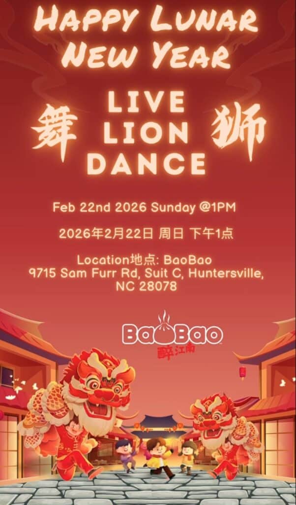 BaoBao: Dim Sum & Authentic Chinese Cuisine, at 9715 Sam Furr Road, Huntersville, North Carolina, is celebrating the Lunar New Year with a Lion Dance! Announced on Facebook.