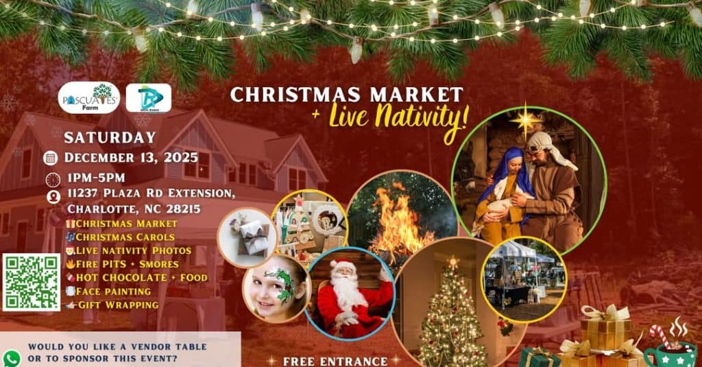 Pascuales Farm, 11237 Plaza Extension Road, Charlotte, North Carolina, is hosting a Live Nativity and Christmas Market on Saturday, December 13, 2025, from 1 to 5 p.m.