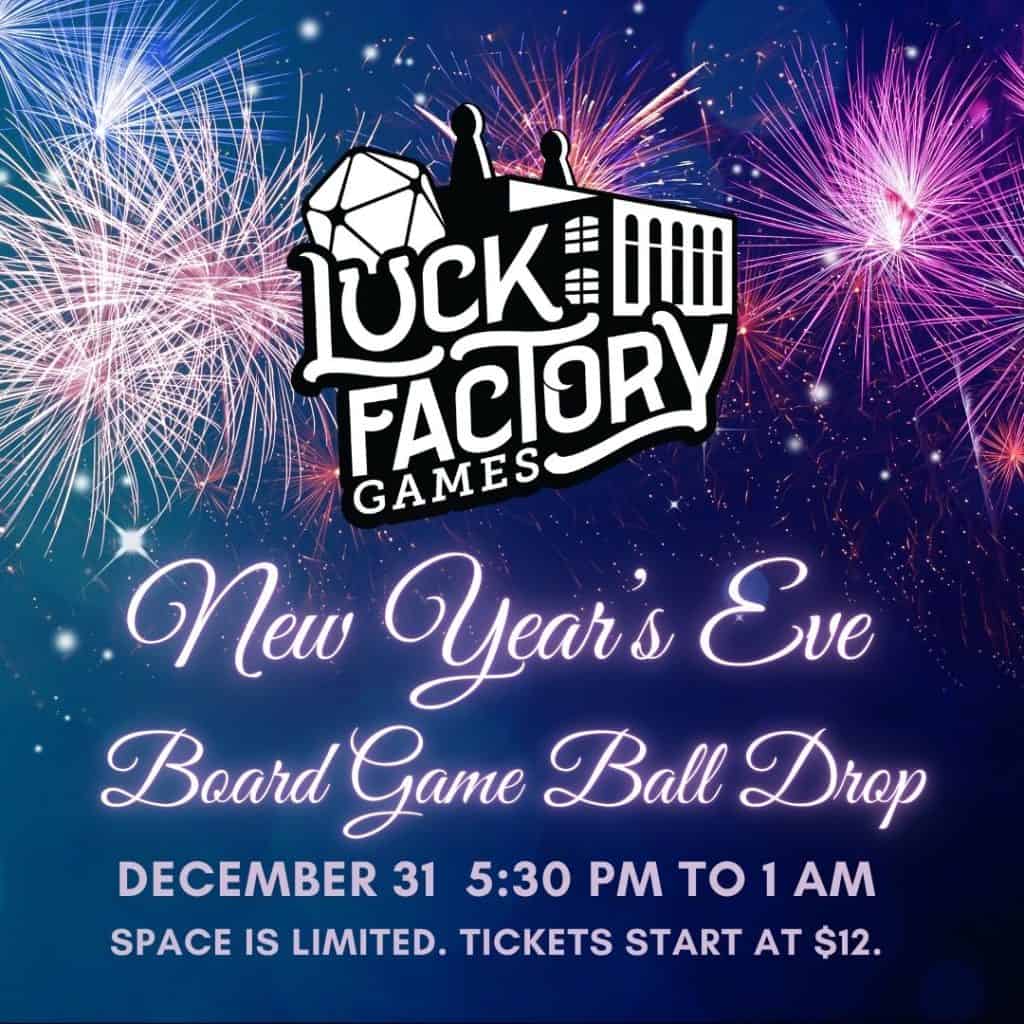 Luck Factory Games is hosting a New Year’s Eve Party. Tickets are $12 for one person, or $20 for two tickets. Each ticket includes one non-alcoholic drink per person.