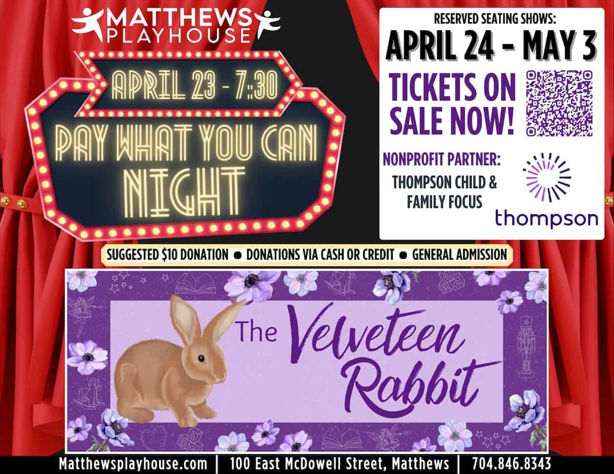 Matthews Playhouse is presenting The Velveteen Rabbit from April 24 to May 3, 2026. Shows are at Matthews Community Center, 100 East McDowell Street, Matthews, North Carolina.
