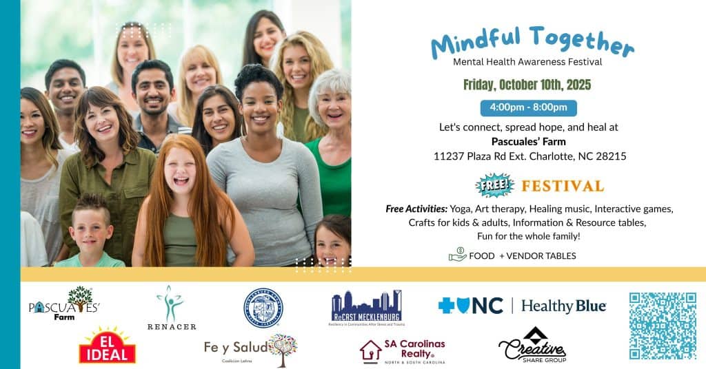 Pascuales Farm, at 11237 Plaza Road Ext, Charlotte, North Carolina, is hosting Mindful Together: Mental Health Awareness Festival on Friday, October 10, 2025, from 4 to 8 p.m.