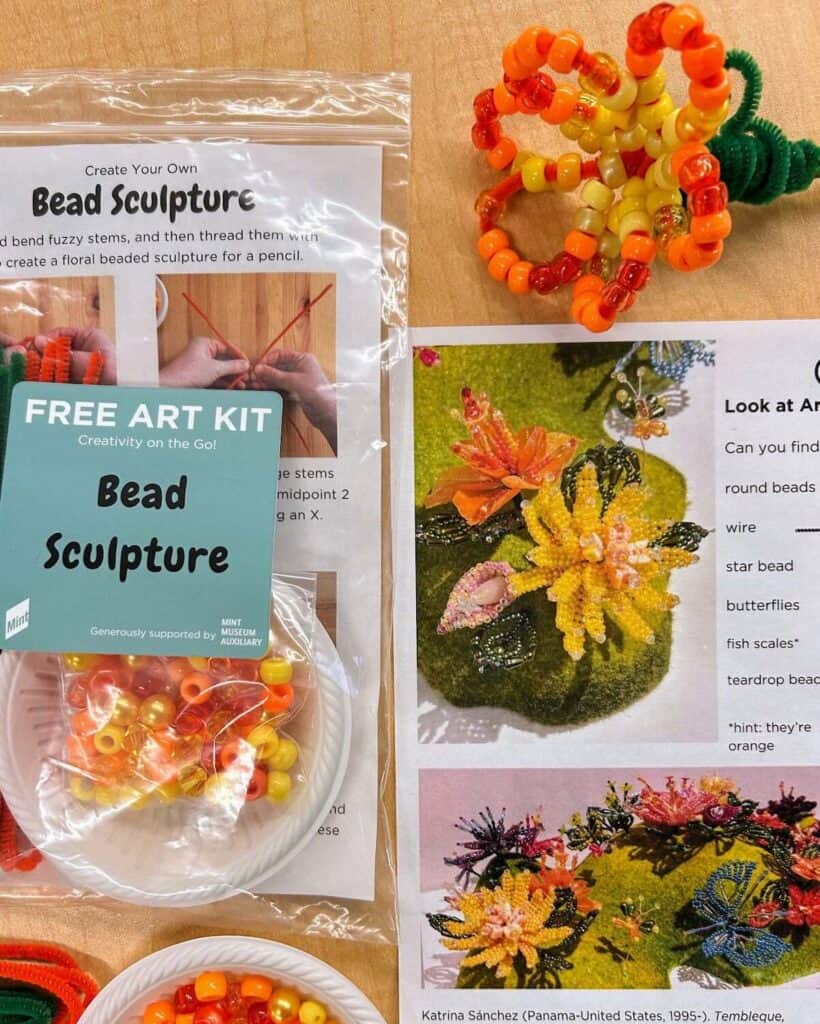 This month use colorful beads and fuzzy stems to construct a work of art inspired by Katrina Sánchez’s tembleque sculpture in “Interventions: Weaving Joy, Woven Resistance” on view at Mint Museum Randolph.