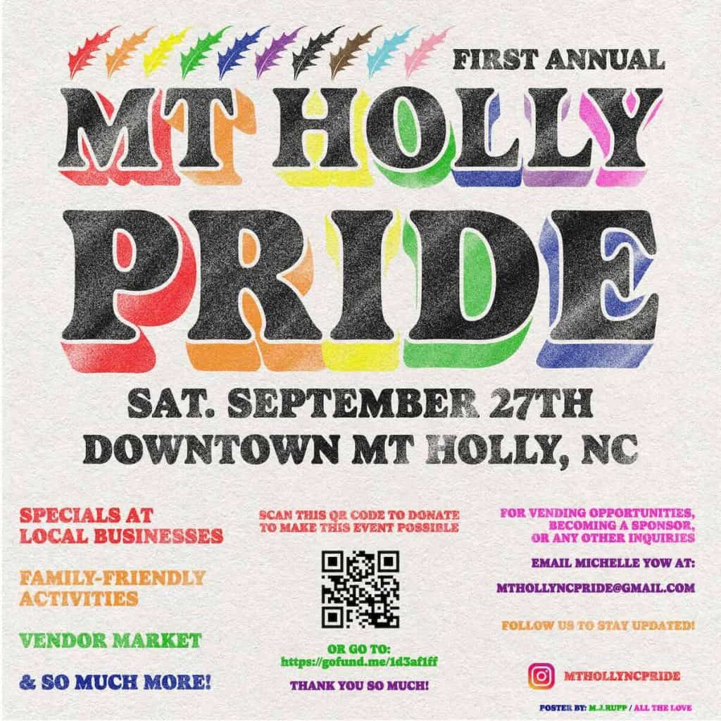 The first ever Mount Holly Pride takes place Saturday, September 27, 2025, in Mt. Holly, North Carolina. This event is organized by participating Mount Holly businesses, and includes a business crawl, vendor market, family-friendly activities and more.