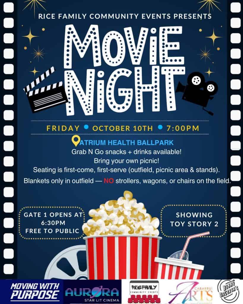 Rice Family Community Events is partnering with the Kannapolis Cannon Ballers to present Movie Night at Atrium Health Ballpark, 1 Cannon Baller Way, Kannapolis, North Carolina, on Friday, October 10, 2025, at 6:30 p.m.