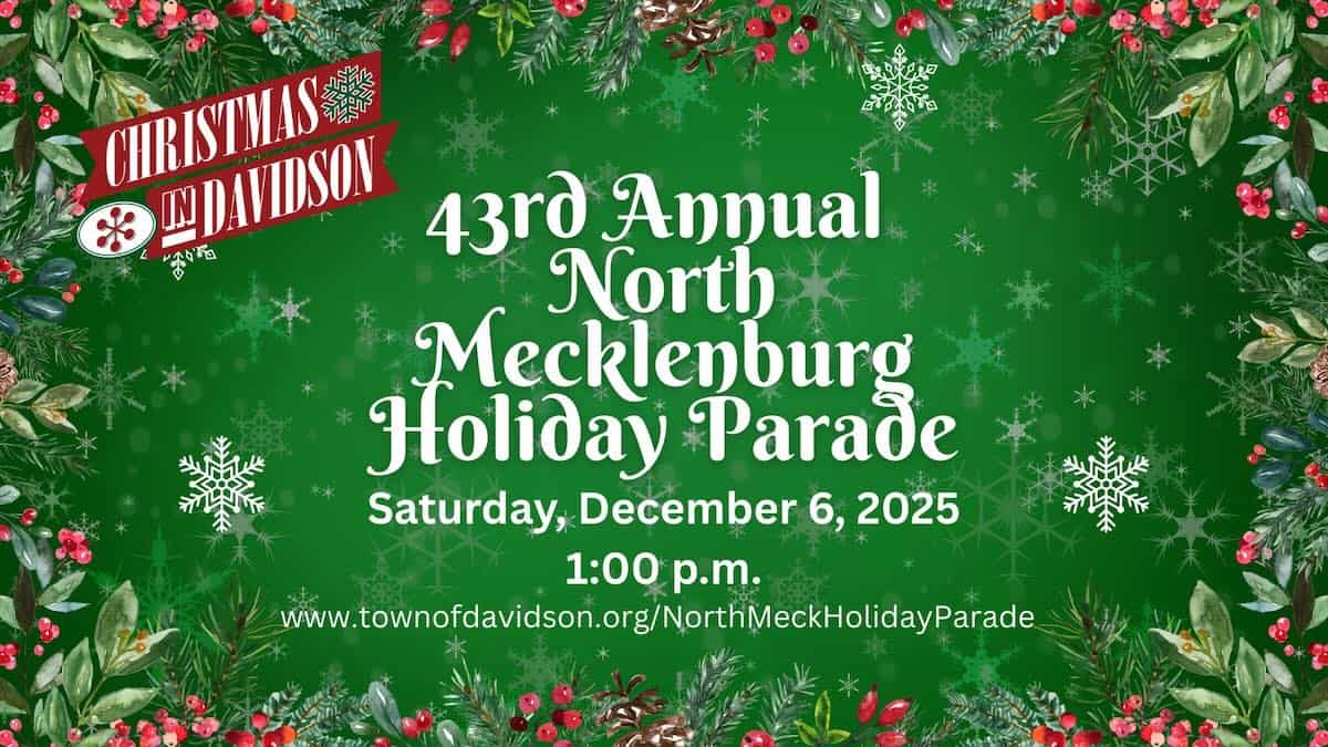 The towns of Davidson and Cornelius are presenting the 43rd Annual North Mecklenburg Holiday Parade on Saturday, December 6, 2025, at 1 p.m.