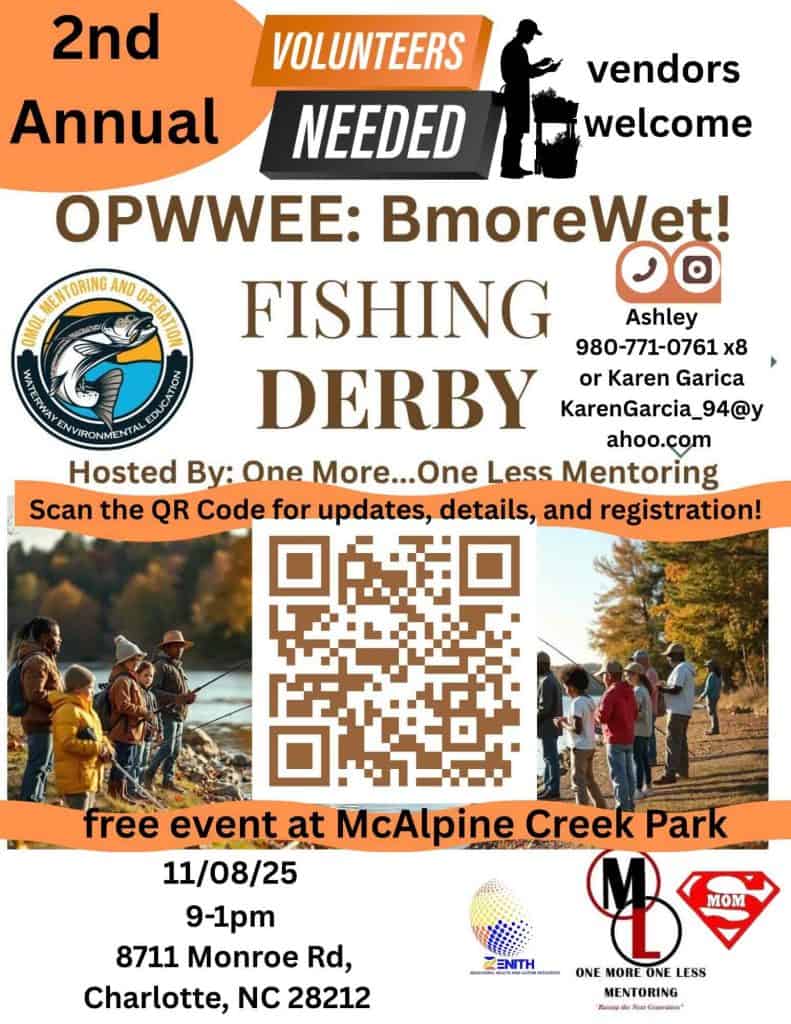 One More…One Less Mentoring is presenting their 2nd Annual Family Fishing Derby on Saturday, November 8, 2025, from 10 a.m. to 1 p.m., at McAlpine Creek Park, 8711 Monroe Road, Charlotte, North Carolina.