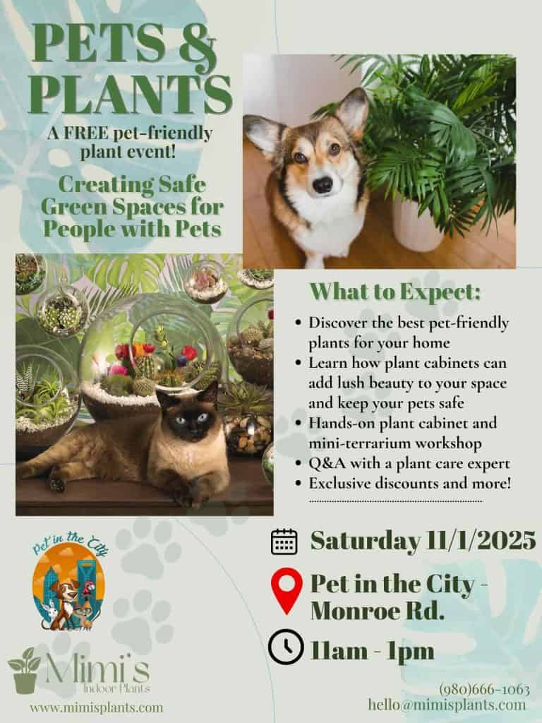 Pet in the City, 9600 Monroe Road, Charlotte, North Carolina, is hosting Pets and Plants: Creating Safe Green Spaces for People with Pets on Saturday, November 1, 2025, from 11 a.m. to 1 p.m.