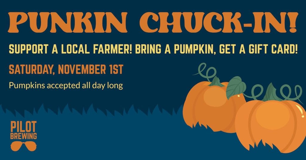 Bring your pumpkins to the brewery, and they will donate them to a local farmer for feed! Donate a pumpkin and you’ll receive a Pilot Brewing Beer card as a thank you. One beer card per person.